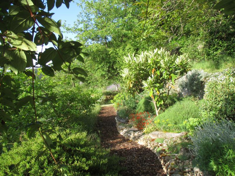 Weiter unten eine mediterrane Terrasse mit Wollmispel.