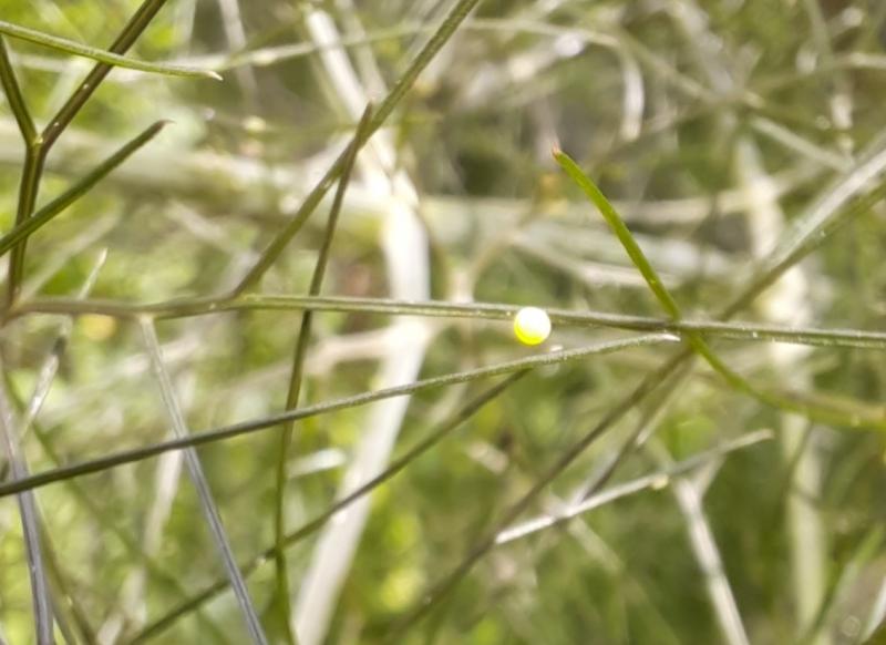 Jedoch hatte ich gestern hochherrschaftlichen Besuch im Garten. Genauer am riesigen Bronzefenchel im Vorbeet. Ein Schwalbenschwanz interessierte sich für selbigen. Heute habe ich mal genauer geschaut und ganze viele Eier entdeckt. Ich hoffe, es funktioniert dieses Mal und es werden nicht wieder alle Raupen von den Vögeln gefressen :(