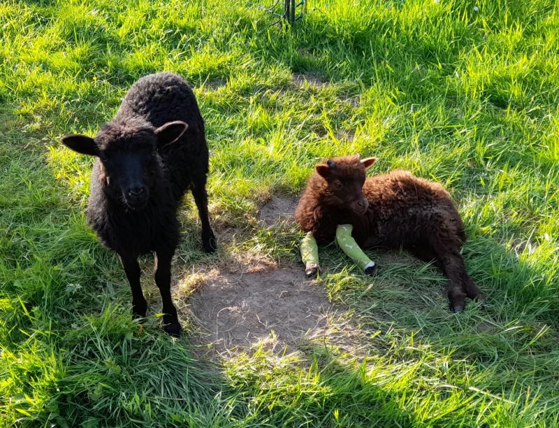 So. Um knapp 15 Uhr komme ich jetzt zur Mittagsfütterung der Lämmer (also die Skuddenlämmer. Estherus und Emil sind auf 2 mal gekürzt). Das kann ich mittlerweile relativ flexibel sehen, weil die nur wegen Lilliput noch 3 mal täglich bekommen. Neben der Milch gibt es wieder schicke neue Schienen für ihn. Ein vorletztes mal neue Beinchen für den Lütten, bevor er Montag mit mir durch die Republik saust...