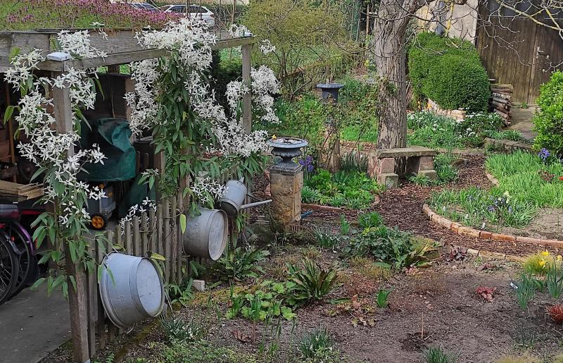 Die Clematis armandii nach wie vor unbeeindruckt. Allerdings muss es diese Woche mal etwas kälter gewesen sein, oben ist sie etwas braun geworden. Man sieht es aber kaum noch.
