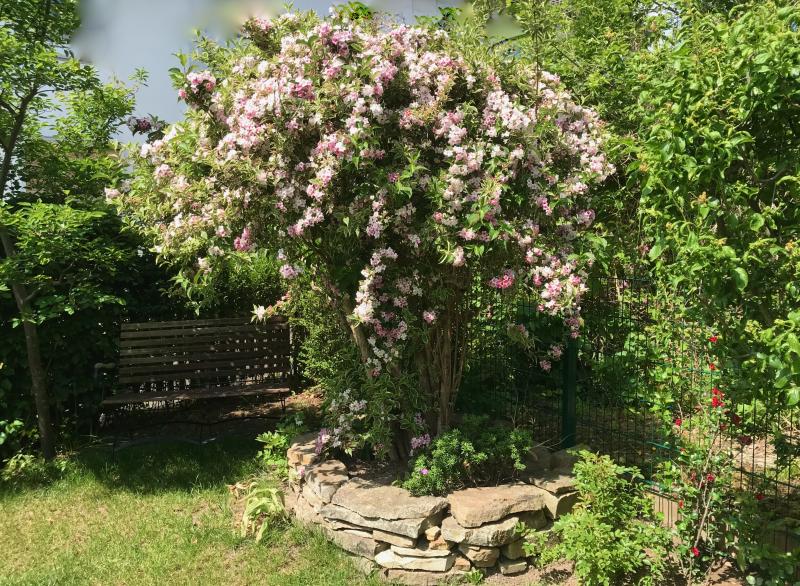 Bei uns war sie schon im kleinen Garten, als wir das Haus übernommen haben. Eigentlich mag ich keine Weigelien, aber diese liebe ich sehr. Sie blüht immer langanhaltend und reichhaltig und ihre manchmal etwas wilden Auswüchse lassen sich gut frisieren. Sie steht bei uns ab Erdoberfläche auf ca. 2,5 Meter Höhe, aber bei ihrer Schnittverträglichkeit würde sie bestimmt auch als Heckenpflanze gut funktionieren. Ich finde, dass jeder zu beglückwünschen ist, der mindestens ein Exemplar in seinem Besitz hat :D.