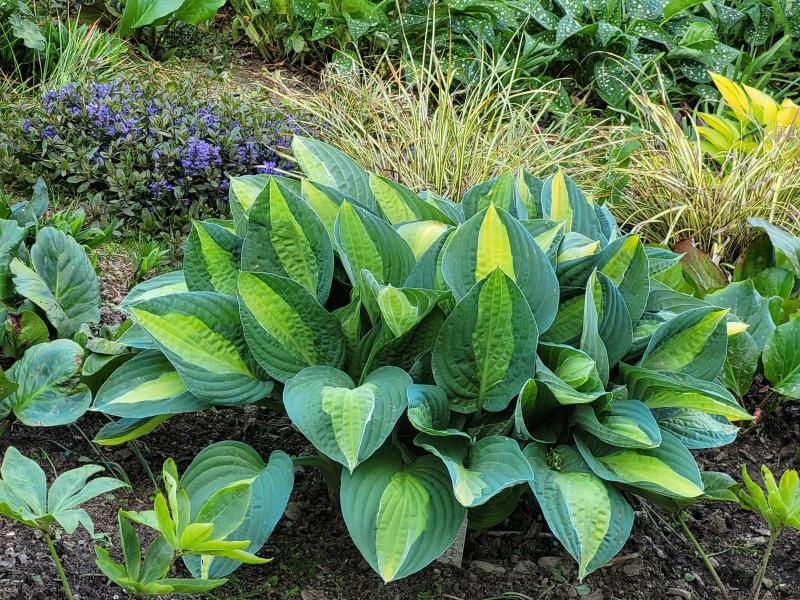 Hosta 'Risky Business'... ist etwas später dran mit spektakulär weißer Blattmitte. Darunter ein Knaller mit Hosta 'June Fever' (?) und nebenan unter der Hortensie mit dem bestehenden Japan Waldgras 'Aureola '.