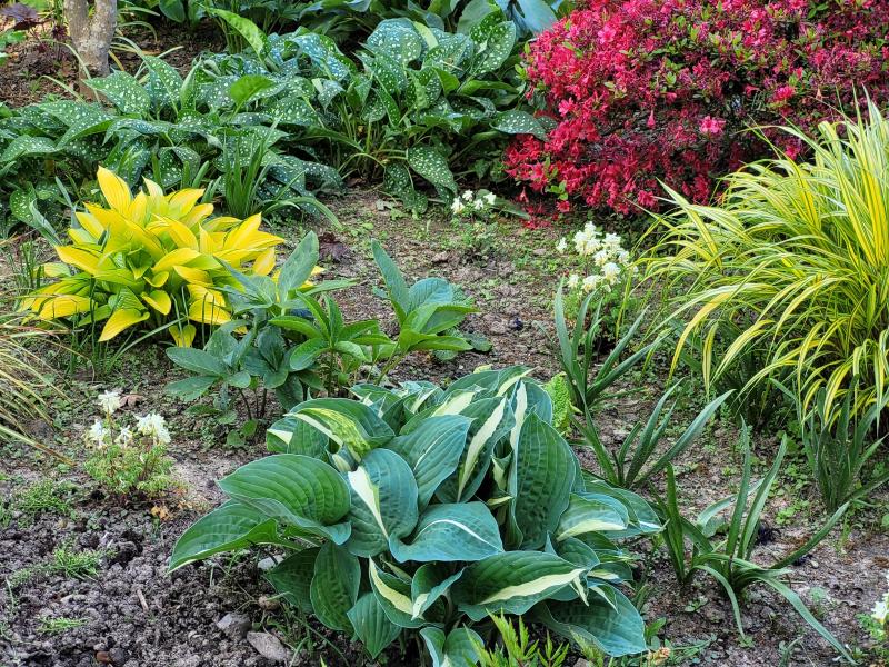 Hosta 'Risky Business'... ist etwas später dran mit spektakulär weißer Blattmitte. Darunter ein Knaller mit Hosta 'June Fever' (?) und nebenan unter der Hortensie mit dem bestehenden Japan Waldgras 'Aureola '.