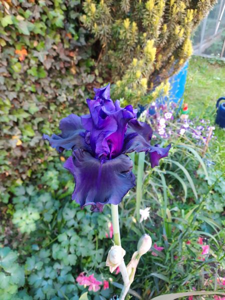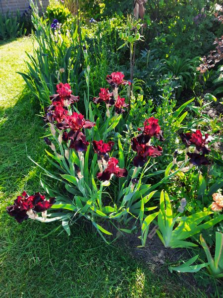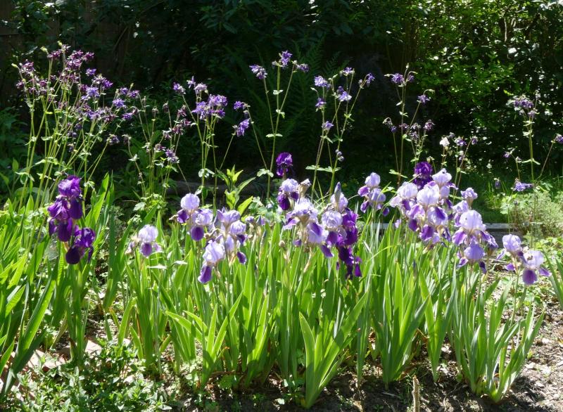Hier nochmal ein besseres Bild von einer Geschwader-Iris, Iris germanica bitone Teresa, wie auch schon im ersten Post dazu korrigiert. Man beachte das Zusammenspiel von Iris und Akelei! die dunklen dazwischen sind typische Iris germanica in blau aus der gleichen Quelle.