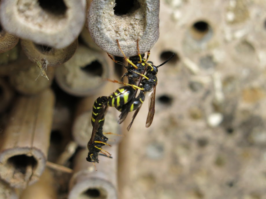 Am alten Wildbienenhaus gab es gestern Spannendes zu sehen. Eine Paarung bei den Solitären Faltenwespen mit zwei Männchen am Start.