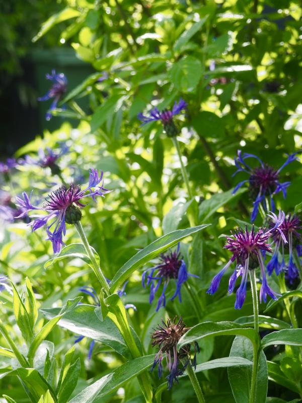 es blüht auch die Bergflockenblume, im Morgenlicht des heutigen Tages verbreitete sie eine ansteckende Fröhlichkeit... auch die Bienen lieben sie. Allerdings sieht sie im Verblühen dann irgendwann strubbelig aus. Dann schneide ich sie radikal zurück und sie legt von vorne los.