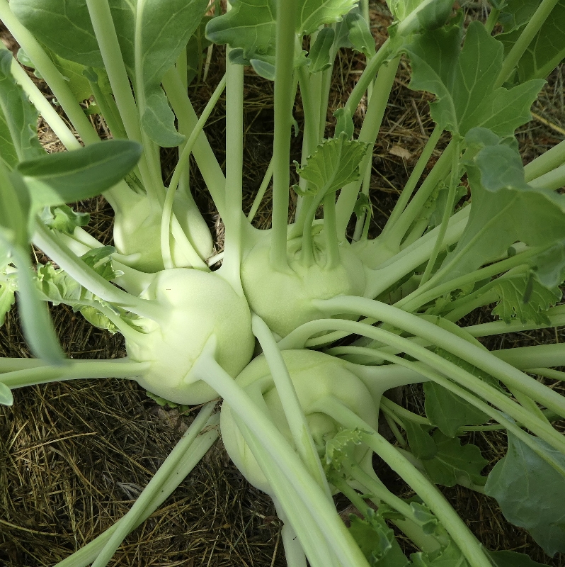 Aus dem Kuriositätenkabinett: Bei einem der Kohlrabis war wahrscheinlich eine Schnecke gründlich zugange gewesen, übrig geblieben waren nur zwei winzige Blättchen ganz unten, alles andere inklusive Apikalknospe war weg. Ich hatte die Pflanze eigentlich rausreissen wollen. Glücklicherweise war ich dann aber abgelenkt worden, danach geriet es in Vergessenheit. Später tauchte ein Ring von frischen, neuen Blättchen auf. Jetzt sieht es so aus: Fünf kleine Kohlrabi, wo sonst einer wächst. :D