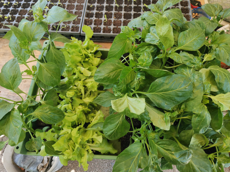 Links Blockpaprika, rechts orangene Spitzpaprika. Von diesen Sorten kostet das einzelne Saatgutkorn den Hobbygärtner fast ein Euro, die Jungpflanzen wie auf dem Bild kosten vermutlich um die 80 Cent, evtl noch 7% Mehrwertsteuer drauf.
