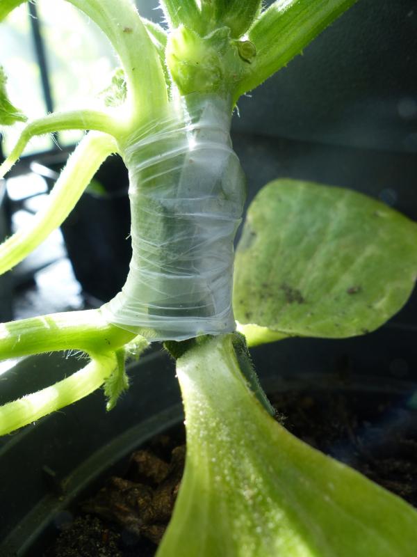 Diesmal habe ich (auch aufgrund der fortgeschrittenen Größe mit Gegenzungen veredelt und zwar so, dass die Melone noch ihre Wurzel in einem separaten Topf behält. Mangels geeigneter Clips habe ich einfach mit Parafilm zusammen gebunden, oder Wäscheklammern.