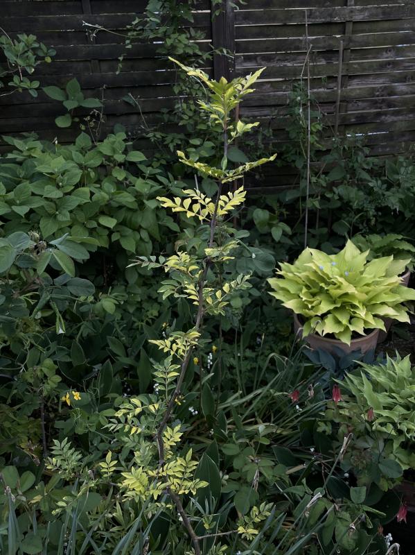 so ein goldpanaschierter zanthoxylum bringt im abendlicht ein schönes leuchten in die rumpeligste gartenecke. :D