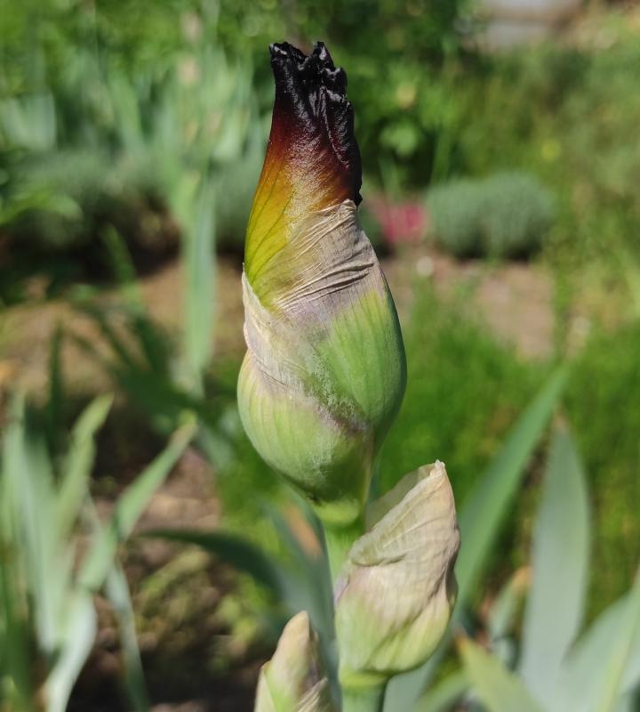 Ich versuche gerade die Irisblüten aus den Hüllblättern "raus zu gucken". Hier bei 'Fort Apache' hatte ich noch keinen Erfolg. Das Ding hat zuletzt 2013 ! geblüht. Gerade auf einem alten Bild gesehen da lagen blaue Körnchen neben der Iris. ;D