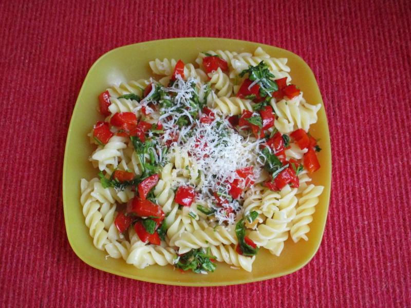 Hier nur schnelle Spirelli mit Paprika und Ruccola.