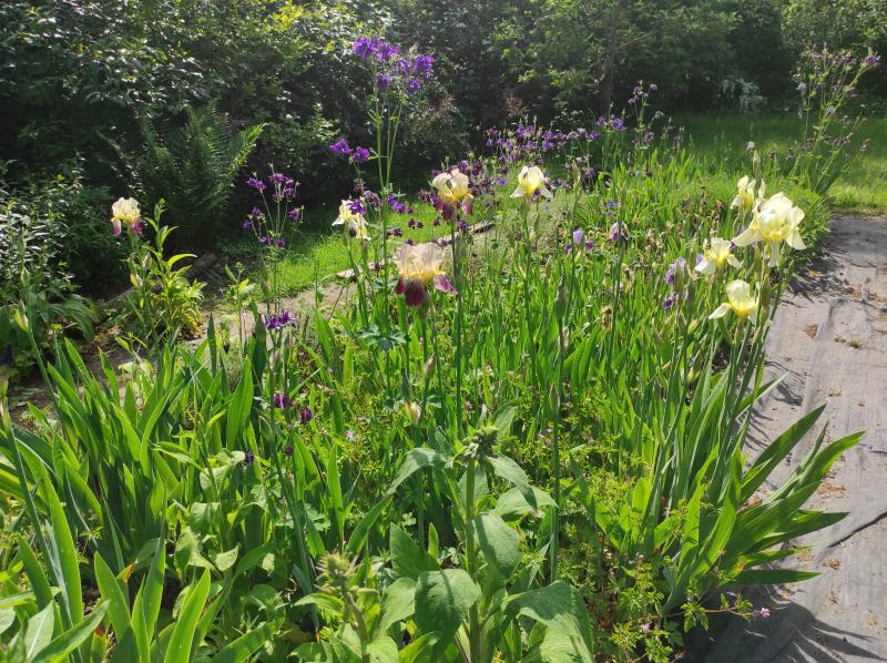 Auch mal ein Blick in die Iris-Station. In diesem Streifen wohnen Klassiker: pallida, flavescens, squalens, germanica, Burgen-/Geschwader-Iris wie Natura* und last but not least sambucina.