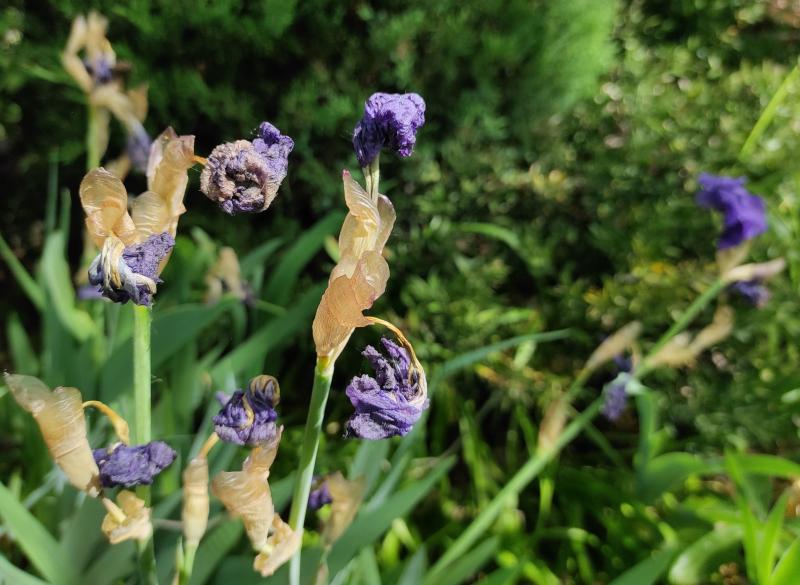Ich versuche gerade die Irisblüten aus den Hüllblättern "raus zu gucken". Hier bei 'Fort Apache' hatte ich noch keinen Erfolg. Das Ding hat zuletzt 2013 ! geblüht. Gerade auf einem alten Bild gesehen da lagen blaue Körnchen neben der Iris. ;D