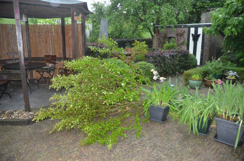 Das ist das Schlimmste!! Eine tolle Lagerstroemia, vor Jahren aus Italien importiert, hat der Sturm regelrecht abgedreht und darunter ein grosse Iris Marie José Nat und die Dualton begraben und abgebrochen, es giesst immer noch, weitere Schäden ab heute Mittag um 15 Uhr. :P :o :-\ :'(