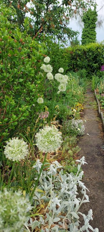 Der Vorgarten hat nun komplett auf blau-lila "umgeschaltet", die Dichternarzissen sind endgültig verblüht, und Allium hat zusammen mit den Nachtviolen das Regiment übernommen. Ich bin sehr froh, dass ich letztes Jahr noch ca. ein Dutzend Sämlinge ausgepflanzt habe, sie sind wunderbare "Lückenfüller" gerade in neu angelegten Beeten, und zum Glück haben sie auch im Winter noch ganz gut zugelegt, so dass die Stängel hoch aufragen und mit unzähligen herrlich duftenden Blüten besetzt sind. Vor allem am Zierlauch summt und brummt es unentwegt, hier tummeln sich Bienen aller Art in großer Zahl.