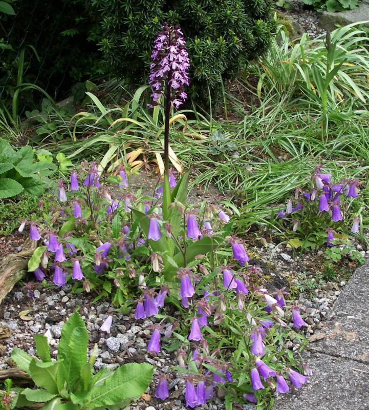 Orchis purpurea und Symphiandra ossetica (glaub' ich wenigstens), wobei ich die Symphiandra dort nie hingepflanzt habe. Die sucht sich selbst den ihr zusagenden Standort.
