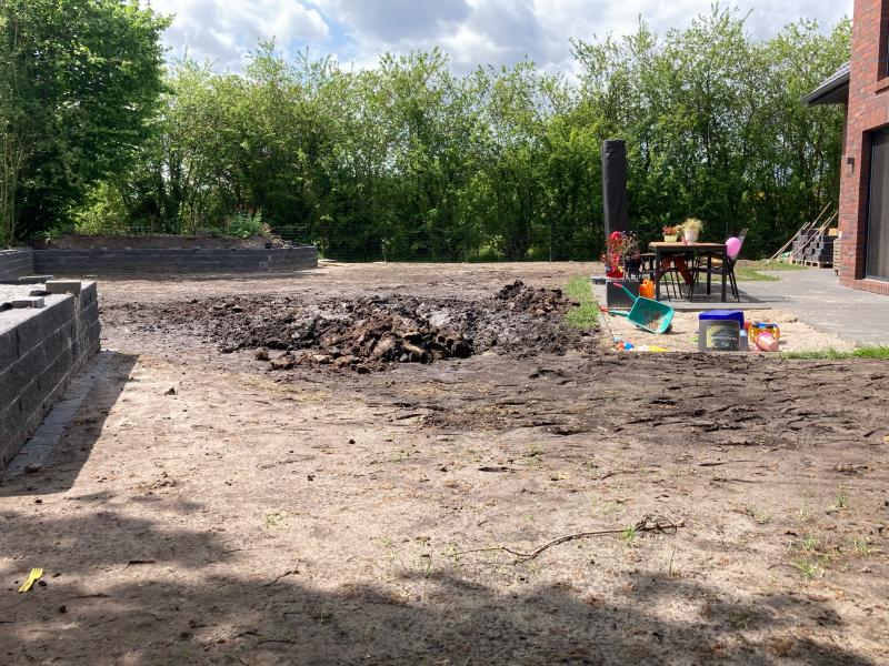 Einen Spielbereich für die Kinder mit Sandkasten etc. haben wir auf der einen Seite des Gartens schon angelegt. Dort ist alles gut, allerdings ist es dort auch höher, als im Rest des Gartens....