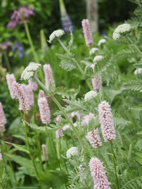 Voll in Blüte steht bistorta officinales superba. Den mag ich sehr, wenn der Wind durch das Beet weht, wiegen sich die langen Blütenkerzen. Direkt dahinter die Blütenstände von achillea Coronation gold. Eine sehr schöne Sorte mit ordentlicher Wuchskraft und kräftigem Laub. Bald öffnet sie ihre großen, goldgelben Blütenteller. Sieht toll zusammen aus.