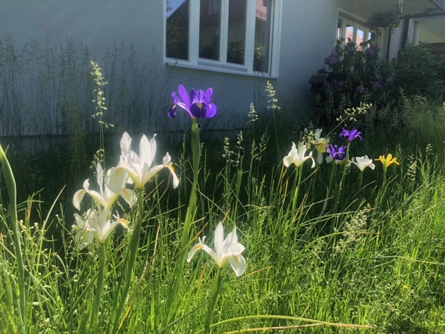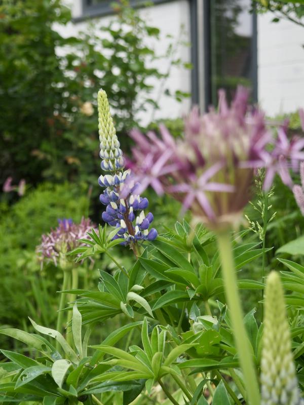 und dann noch Lupinen mit Allium christophii. Im Augenblick ist vieles im Vorgarten violett, rosa oder bläulich.