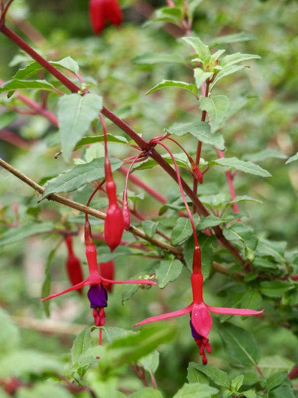 hier hat die Fuchsia magellanica bereits mit der Blüte begonnen. Dank des milden Winters treiben Blätter und Blüten dieses Jahr am alten Holz aus. Damit dürfte die Blühphase der Strauchfuchsie von Mai bis wahrscheinlich in den November hinein dauern... es sei denn, es wird früher kalt.