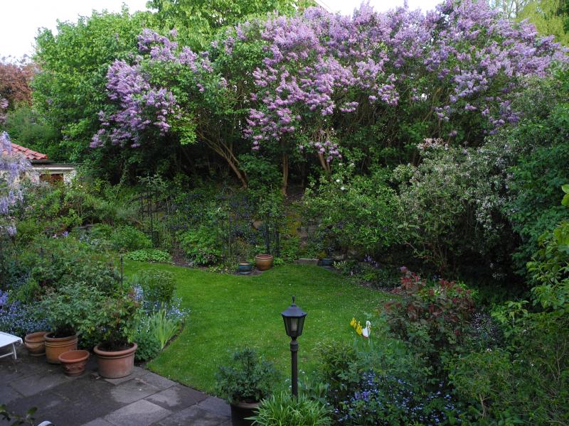 Da das Haus mitten im Garten steht, kann man aus den Fenstern in jeden Gartenbereich zum Flieder schauen, und der Duft ist besonders gegen Abend einmalig: