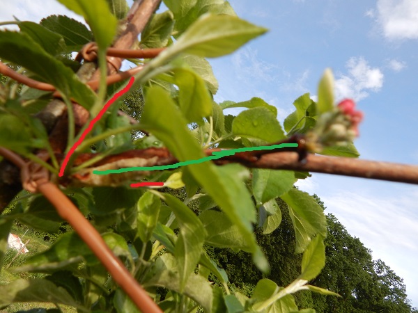 hier das gleiche Foto mit Markierung "grün" das Edelreis, Markierung rot sind die Triebe (der vordere kräftigere und der hintere schwächer) vom Sämling.