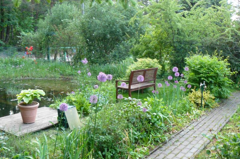 Am großen Teich gibt es verschiedene Sitzplätze... unter anderem ein kleine Bank und eine Hängematte, gerade wegen des Regens außer Betrieb. Und außerdem sehr vielfältigste kleine Gehölze und Stauden.