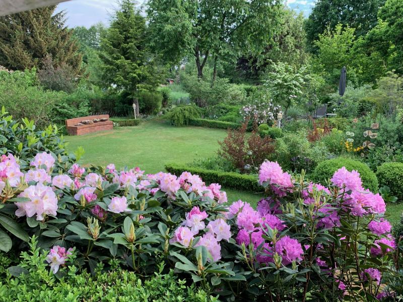 von dort aus kann man quer durch den Garten blicken. Viele alte Laub- und Nadelgehölze, die den Garten einfassen.