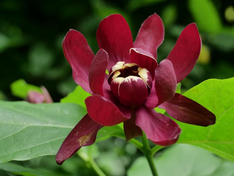 Calycanthus floridus 'Aphrodite' beginnt zu blühen. Vom Duft ist bei der momentanen Witterung nicht viel zu bemerken.