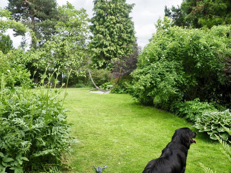 von dort aus kann man quer durch den Garten blicken. Viele alte Laub- und Nadelgehölze, die den Garten einfassen.
