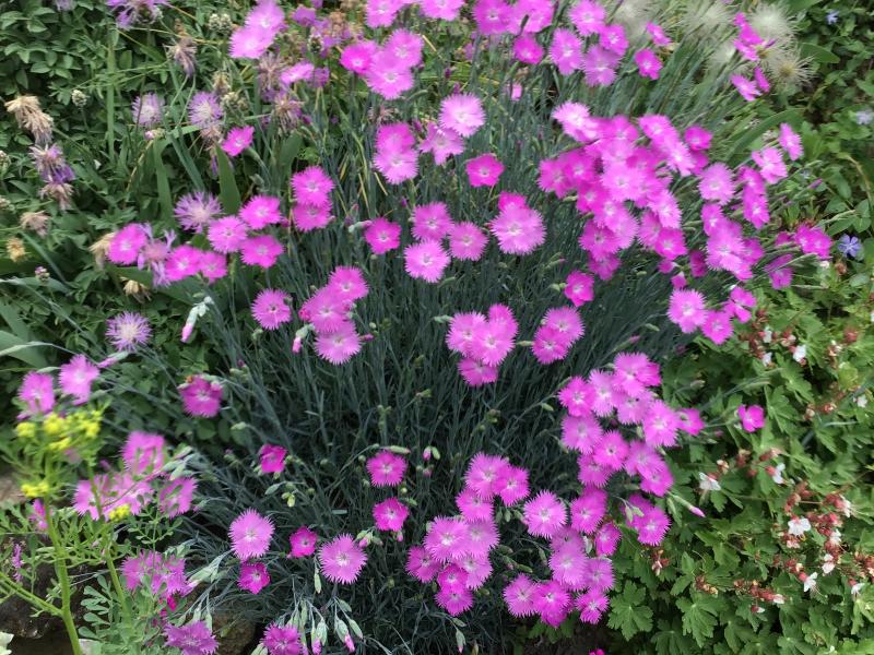 Im Steingarten blühen jetzt die Federnelken. es sind keine benannten Sorten ich habe sie selbst aus Samen gezogen. Eine ist sehr schön rosa und hat ganzjährig ein perfektes grün-blaues Polster