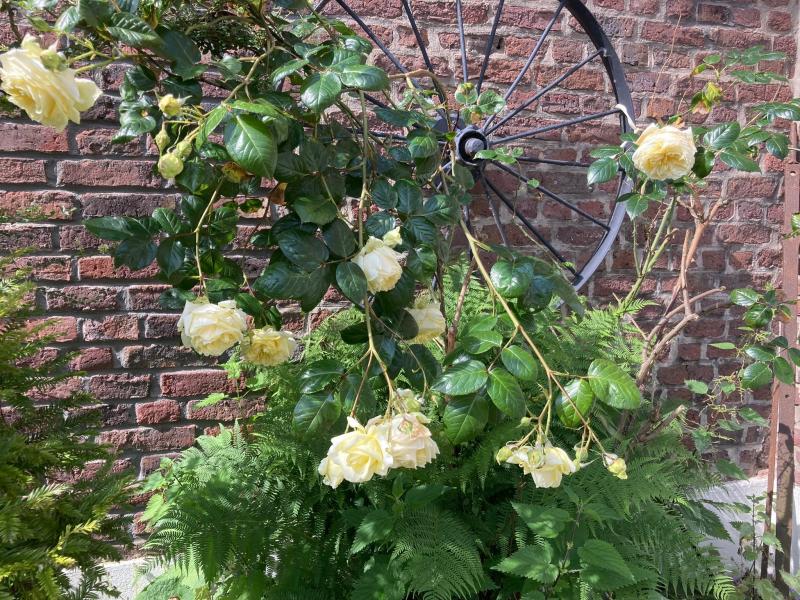 Die helle, fast weisse ist New Dawn. Die hellgelbe ist Elfe. Dann gibt es noch eine Unbekannte in rosa und Ghislaine, die zum Tor herüberrankt. Und das andere Monster im Remisenhof ist Veilchenblau.
