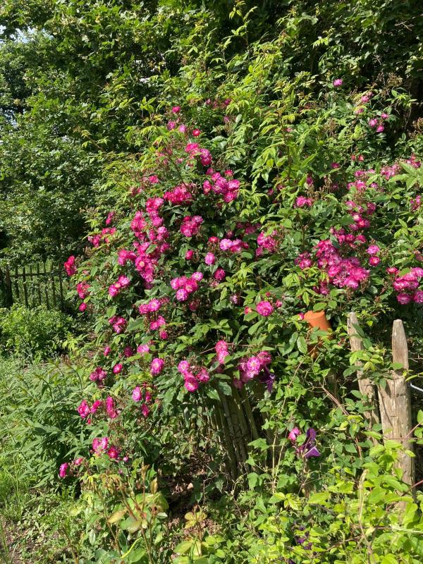 Nun noch Kiftsgate Violet hinter dem Gewächshaus, schon in Büte, während Maria Lisa erst Knospen zeigt.