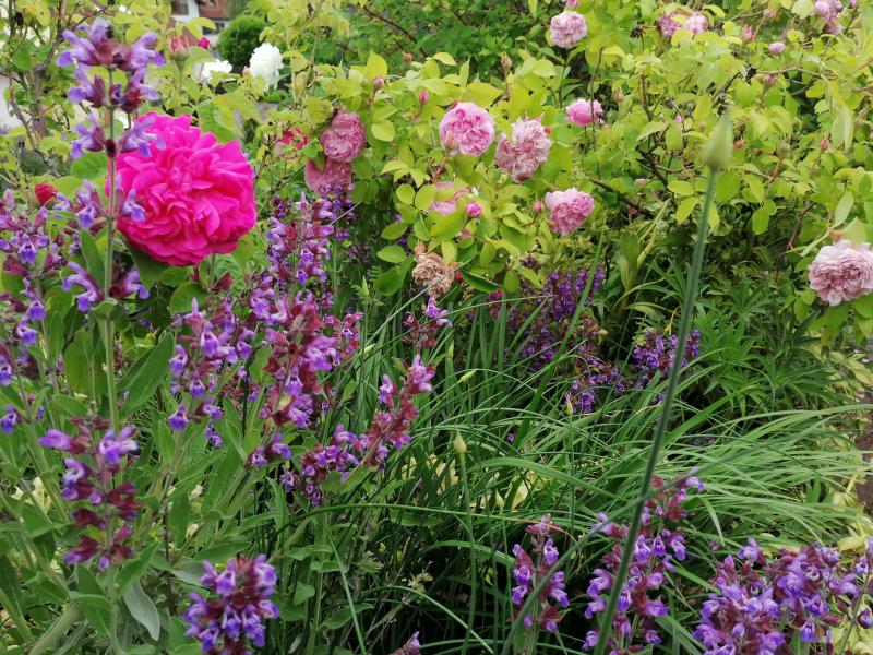 Helianthemum "Wisley Pink", Paeonia "Avalanche", Salvia officinalis "Weißer Main" und Sämlinge, historische Rosen de resht, Sidonie und Rose Lelieur. Lonicera x purpusii duftet von Nov bis April.