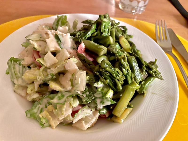 hier ceasar's salad mit (für gg) totgebratenem gartenspargel; auswahl von überwiegend schon zuweit getriebenen grünspargelsprossen