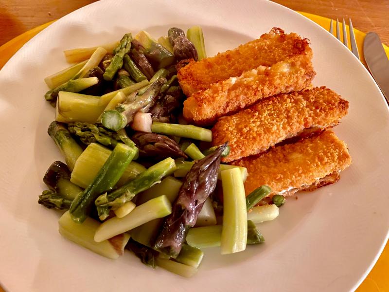 zum abendessen dann gebratener gartenspargel und fischstäbchen aus dem ofen. 8)