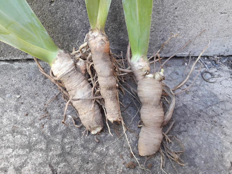 Ein recht typisches Merkmal von `Harbor Blue´ sind für mich die ziemlich lang gezogenen dünnen Rhizome, bei dem in der Mitte besonders gut zu erkennen. Das fällt mir immer wieder auf, weswegen ich es auch mal fotografiert habe, als welche zum Verschicken bereit lagen. Hilft ungerodet selbstverständlich wenig.