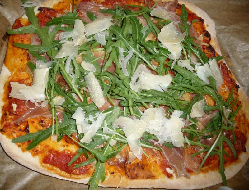 und eine mit Parmaschinken, Rucola und Parmesan.