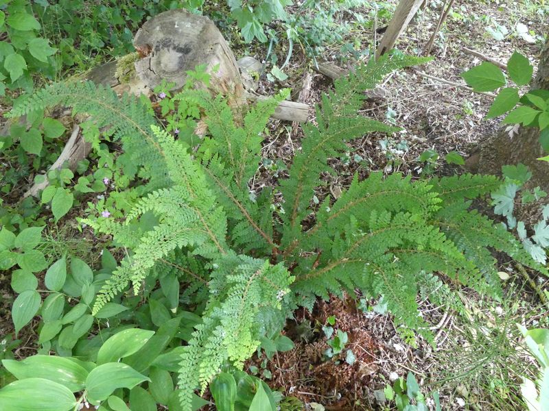 Als letztes noch der zarte Austrieb von Arachniodes simulans 'Rotstiel'.