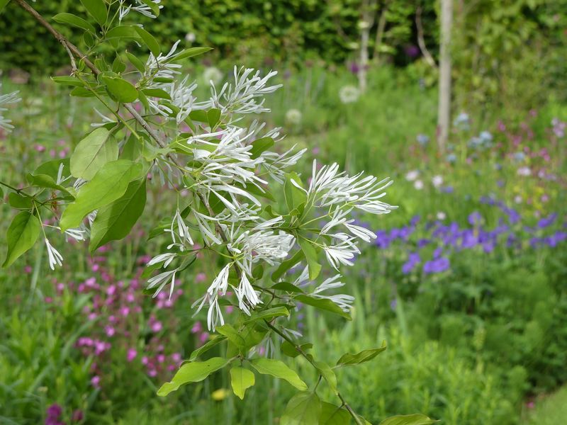 Und noch aus einer anderen Perspektive. Aktuell blüht Chionanthus retusus. Einige Äste sind ihm wieder abgestorben (vermutlich ein Pilz). Mal sehen, wie lange er noch durchhält.