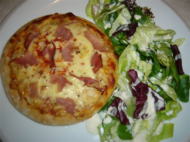 Heute habe ich Brot gebacken, darum gab es eine Bauernpizza (Brot-Teig statt Pizza-Teig) und Salat mit Sauce nach WunschGart, bitte kein OT (Teller etc.) , ich will wissen, was du durch den Trinkhalm geschlürft hast