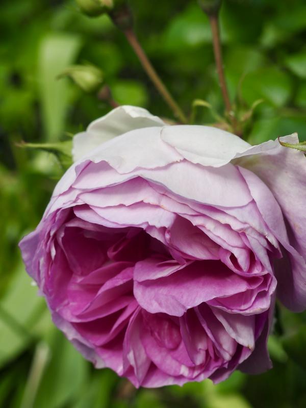 Und die Hechtrose, rosa-violett mit bläulichem Laub.