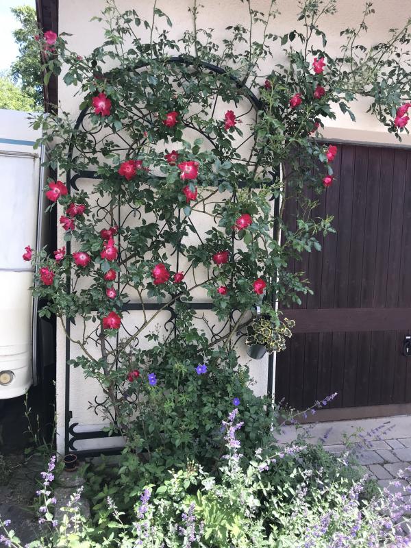 Die Ramblerrose „ Maria Lisa“ ist jetzt kurz vor der Vollblüte. Leider nur einmal blühend mit kleinen, einfachen und duftenden Blüten. Von Hummeln werden die Blüten stark angeflogen.