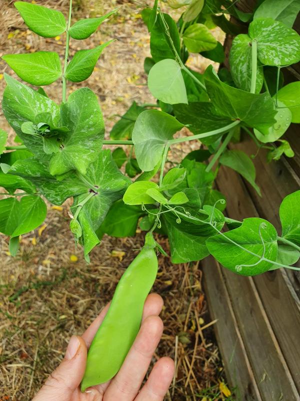 Meine Kinder hatten aber immer schon fleißig genascherntet. Eine hatten sie vergessen, hier die Riesen Zuckerschote.