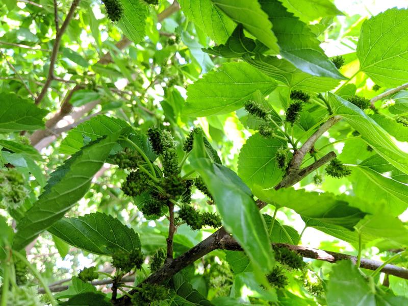 Draußen reift bei mir noch nichts an Maulbeeren, aber meine Morus Macroura Saharanpur im Gewächshaus ist jetzt so langsam reif: