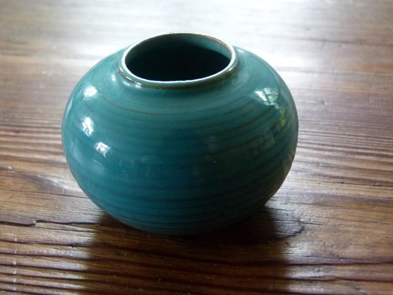 Auf diesen Thread wurde ich aufmerksam, sehr gut! Ich stehe fast mehr auf Glas, aber vor kurzem musste ich dieses Väschen auf dem Flohmarkt erstehen. 50 Cent gab ich aus. Mir gefällt die Farbe sehr, ansonsten finde ich es nicht so leicht, so kleine Vasen zu bestücken.