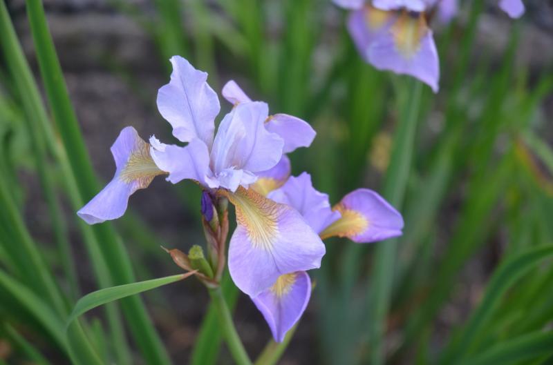 Lapislazuli 2021 Tamberg, daneben ist Laub von Aquilegia vulgaris Mellow Yellow.