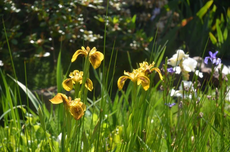 Ebenfalls im Teich: 'Dark Aura'. Nach dem violetten Austrieb fällt sie nun mit den dunklen Blütenstengeln auf, inzwischen ein ziemlicher Trumm.