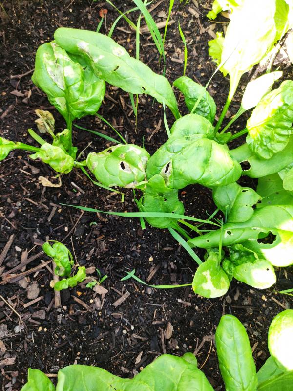 Das er nicht vernünftig wächst liegt wahrscheinlich an zu viel Kohlenstoff im Boden, der legt den Stickstoff fest, der jetzt dem Spinat fehlt. Nach der Ernte, wenn die Mikroorganismen mit dem Stickstoff drin wieder absterben, wird er wieder frei, dann hat aber höchstens die Nachfolgekultur, also das was nach dem Spinat drauf kommt) was davon.